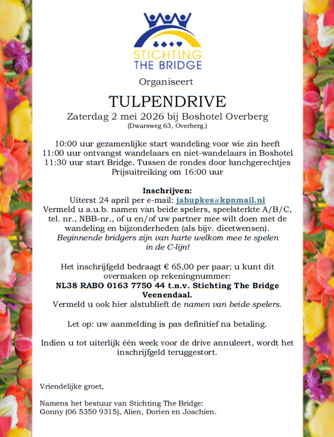 Op dit moment is Aller Erf voor de denksport in Veenendaal de beste locatie die voorhanden is. Als u zou besluiten de capaciteit van het zalencentrum te reduceren tot die van een buurtkamer, legt u een figuurlijke bom onder het spelplezier van 170 denksportliefhebbers in Veenendaal. Natuurlijk, de gemeente belooft in dat geval mee te denken over – en mee te zoeken naar alternatieven. Echter, op dit moment liggen er wat dat betreft naar onze mening alleen mogelijkheden in de sfeer van het apart creëren van een denksportfaciliteit voor Veenendaal – waar dan wellicht ook andere denksportclubs, bijvoorbeeld de schaakvereniging, gebruik van zouden kunnen maken. Qua locatie kunt u dan denken aan een plek op of naast een van de buitensportlocaties in onze gemeente. Een functioneel, gelijkvloers toegankelijk gebouw met een totaal vloeroppervlak van minimaal 350 m2 zou kunnen volstaan en biedt zelfs ruimte voor enige groei. Want het goede nieuws is dat Bridge zich, ook in Veenendaal, weer in een groeiende belangstelling mag verheugen. Om die reden zijn wij ook bezig te onderzoeken welke mogelijkheden wij de jeugd zouden kunnen bieden.